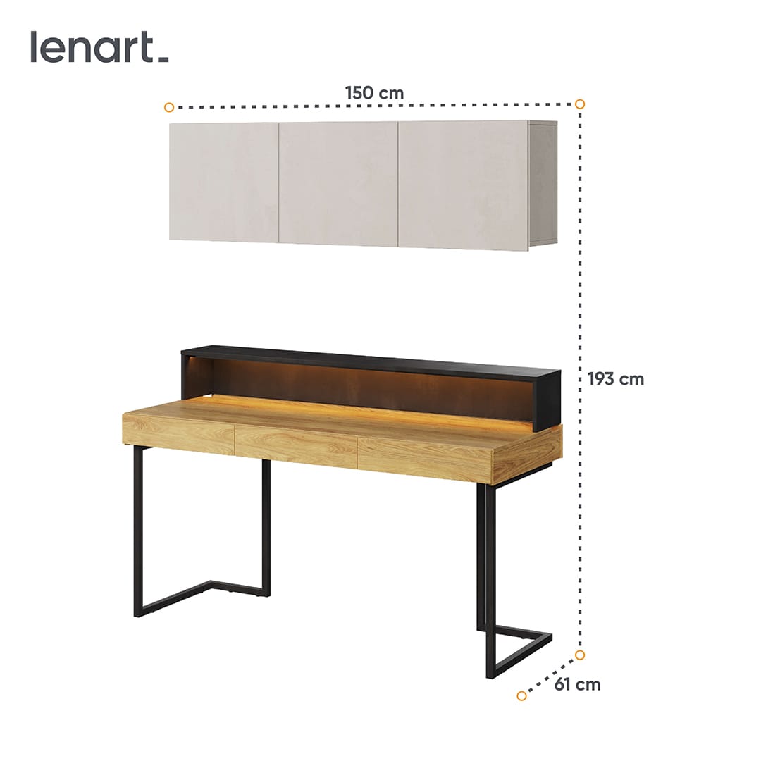 Biurko z nadstawką i szafką wiszącą to rozwiązanie umożliwiające optymalne wykorzystanie przestrzeni w pokoju. Nadstawka zapewnia dodatkowe miejsce do ustawienia monitora komputerowego lub akcesoriów biurowych, które zawsze powinny znajdować się pod ręką. Umieszczone pod blatem szuflady oraz szafka wisząca z potrójnymi drzwiczkami pozwalają utrzymywać porządek w przestrzeni roboczej naszego biurka.