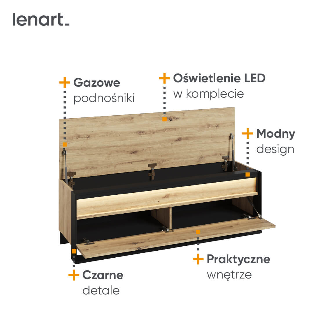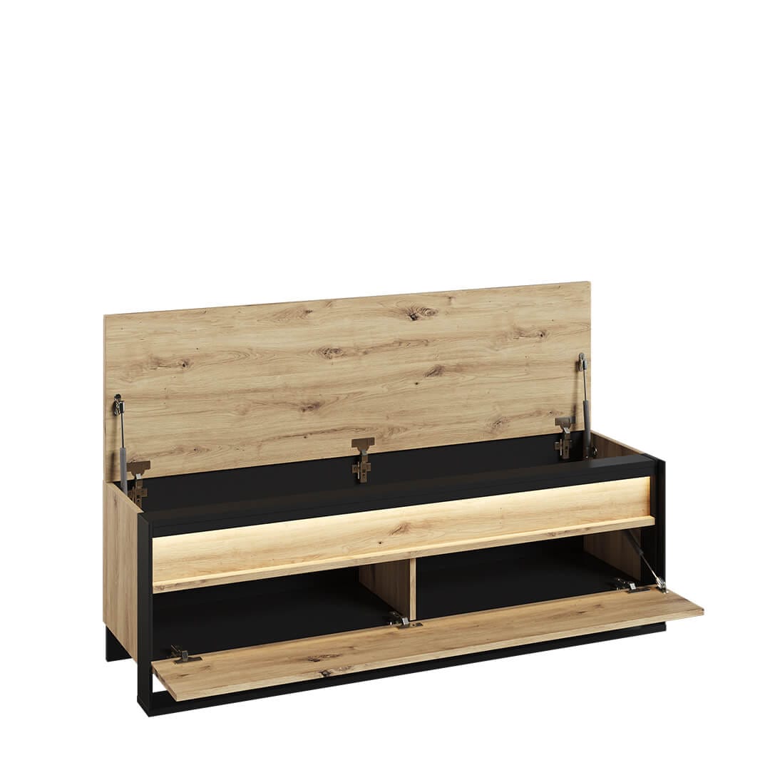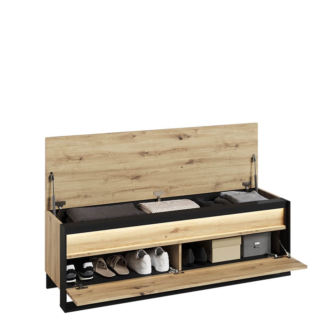 Nasza elegancka szafka na buty z siedziskiem łączy w sobie zalety użytkowe i estetykę. Wyposażona w dwie komory do przechowywania, pomieści wiele par butów, zapewniając porządek i dobrą organizację w Twoim przedpokoju. Dodatkowo, siedzisko na górze szafki pozwoli Ci wygodnie usiąść przy ubieraniu i zdejmowaniu butów. Szafka na buty z kolekcji QUANT wyróżnia się swoim eleganckim designem. Wykonana z dbałością o szczegóły, dodaje wyrazisty akcent do Twojego wnętrza. Bez względu na to, czy preferujesz nowoczesny minimalizm, czy  styl klasyczny – nasza elegancka szafka na buty z siedziskiem doskonale wkomponuje się w Twoje wnętrze. Ponadto została wyposażona w klimatyczne oświetlenie ledowe, które wprowadza do wnętrza przyjemny nastrój.