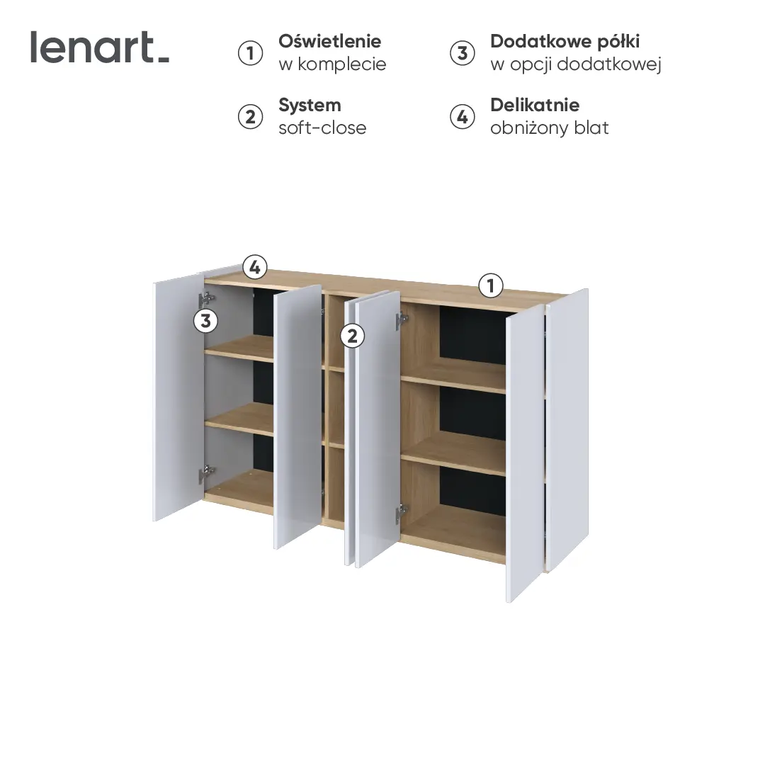 Wnętrze komody można wyposażyć w półki dostępne w opcji dodatkowej. Do komody EA-01 świetnie sprawdzą się zarówno półki EA-04 oraz EA-05.