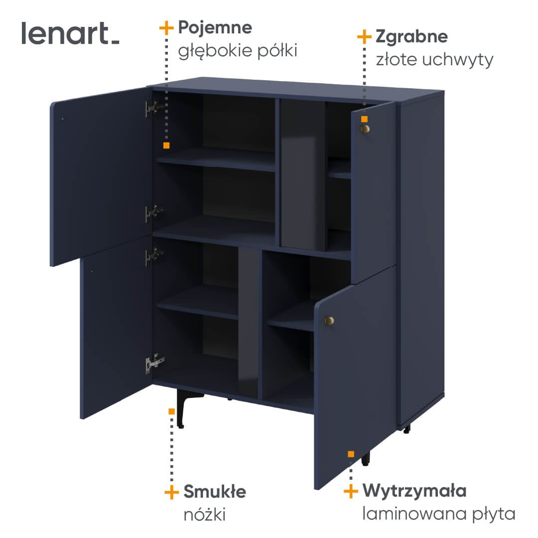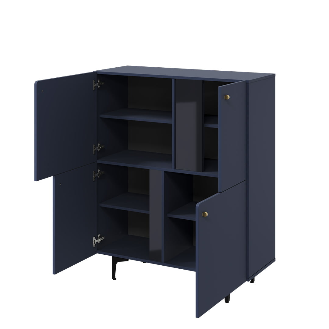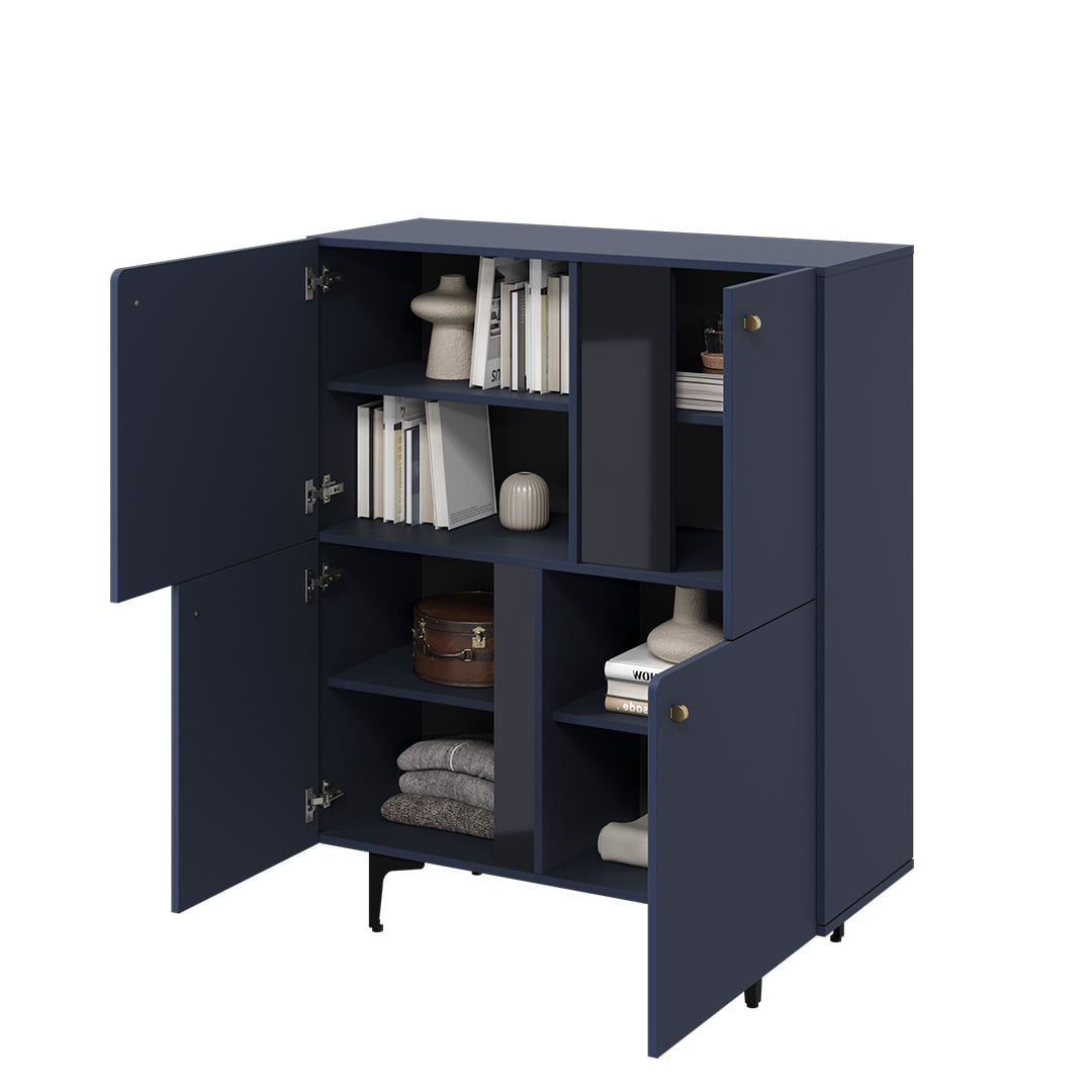 Komoda czterodrzwiowa, która wyróżnia się oryginalnym i niespotykanym stylem. Masywna bryła wspiera się na smukłych nóżkach, dzięki czemu całość wygląda lekko i nowocześnie. Wyrazisty odcień ciemnego błękitu świetnie prezentuje się w towarzystwie detali w kolorze połyskującej czerni. Fronty ozdobiono zgrabnymi, złotymi uchwytami. Bardzo ciekawe są też frezowane krawędzie wybranych frontów, które stylowo podkreślają nowoczesny charakter mebla.