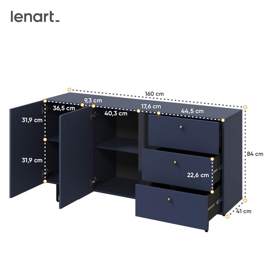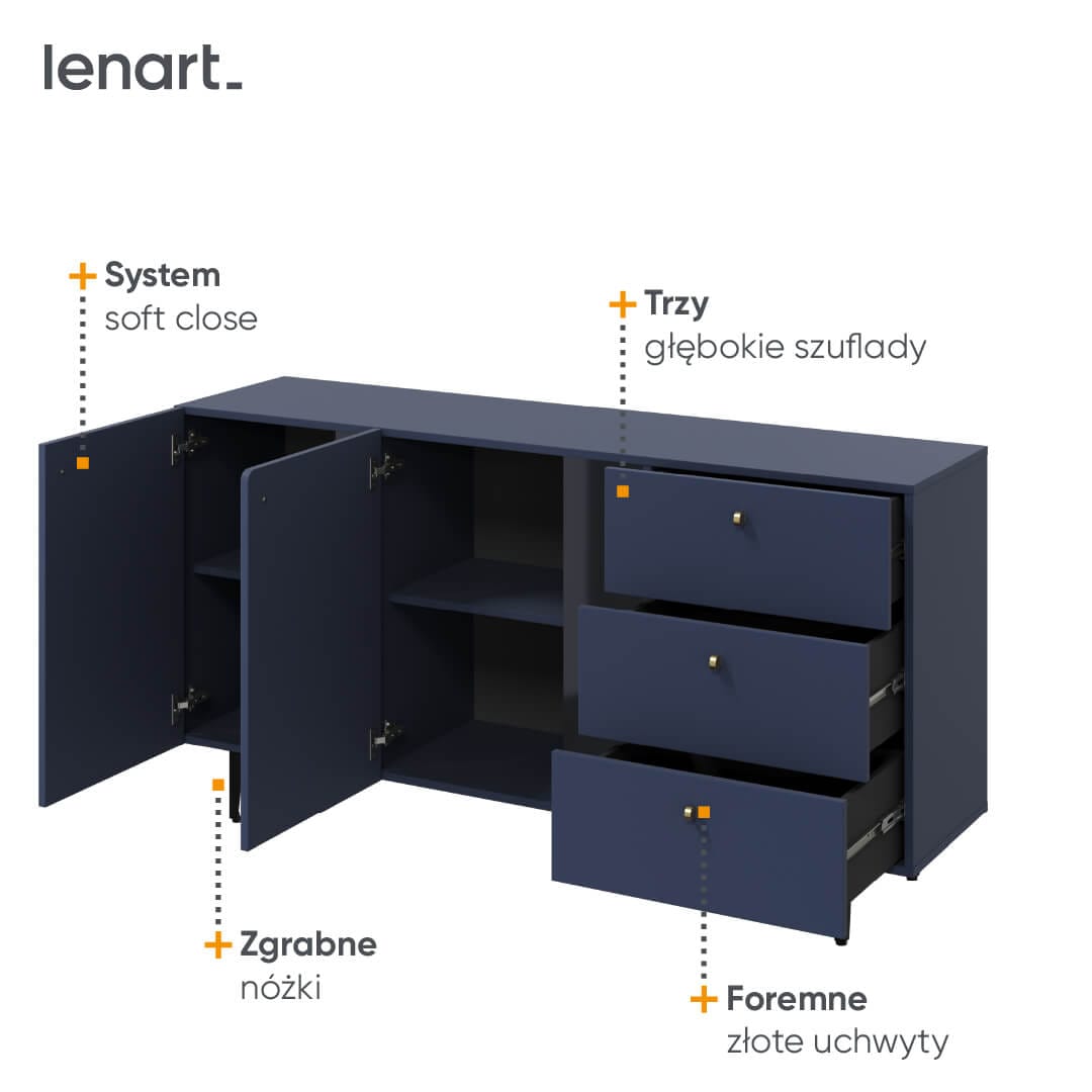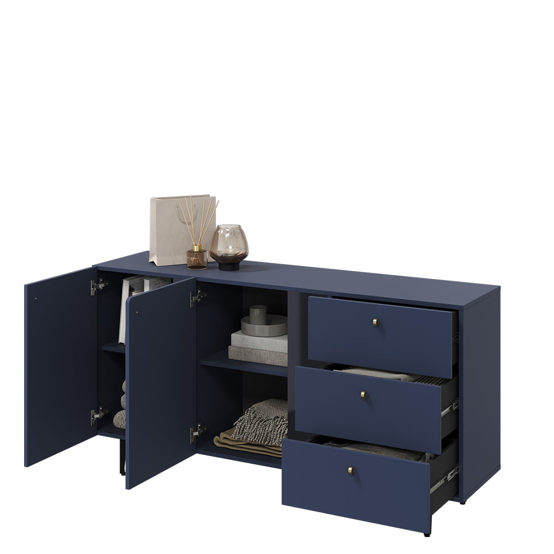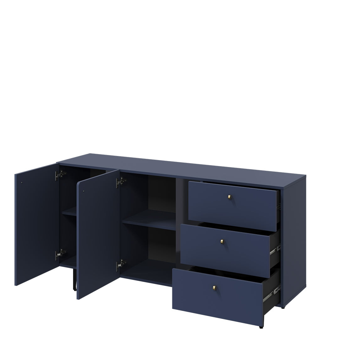 Komoda wyróżnia się oryginalną formą – zgrabne nóżki, foremne uchwyty w kolorze złota oraz atrakcyjnie zaokrąglone krawędzie wybranych frontów tworzą wyjątkowy efekt. Ciekawa jest też kompozycja kolorów – dominujący ciemny błękit pięknie komponuje się z detalami o barwie czerni w połysku, dodatkowo podkreślając efekt 3D na froncie.