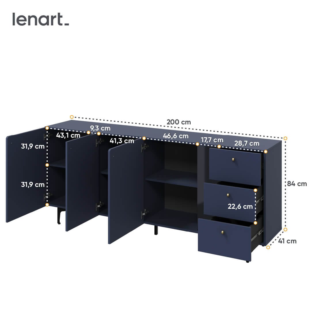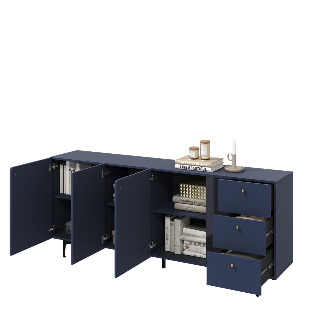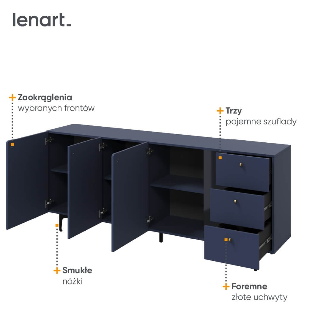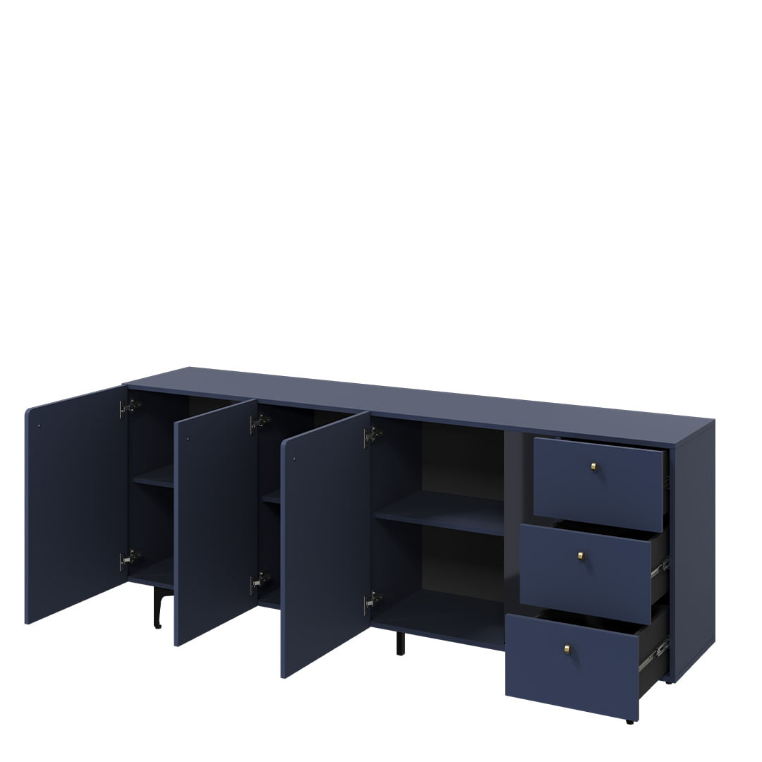 Komoda wyróżnia się zdecydowanym kolorem – ciemny błękit w połączeniu z czarnymi detalami prezentuje się modnie i nietypowo. Taki duet kolorystyczny to też sposób na wyraźne zaznaczenie efektu 3D na froncie mebla. Charakterystyczne zaokrąglenia wybranych frontów podkreślają niesztampowy styl komody. Całości dopełniają nieduże, zgrabne uchwyty w złotym kolorze oraz smukłe nóżki, dzięki którym bryła wydaje się lekka, mimo swoje masywności.