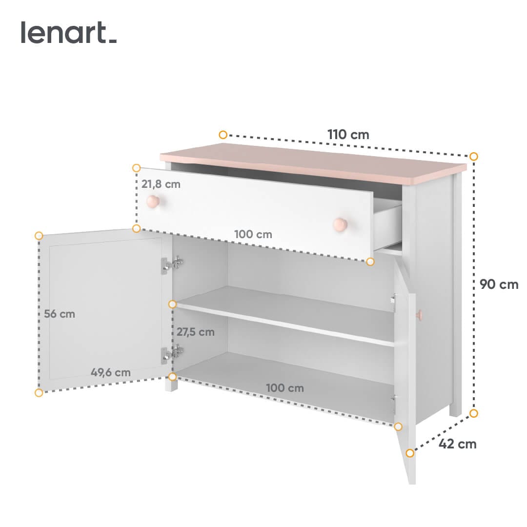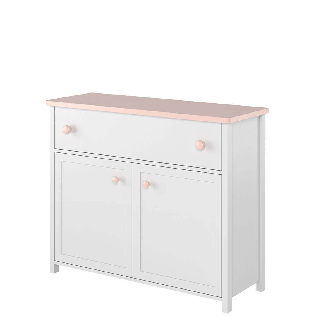 Mebel wyróżnia się oryginalnym charakterem. Bryła w kolorze ej bieli oraz blat i dodatki w kolorze pudrowego różu tworzą niepowtarzalny styl, który spodoba się wielbicielkom bajek o księżniczkach.