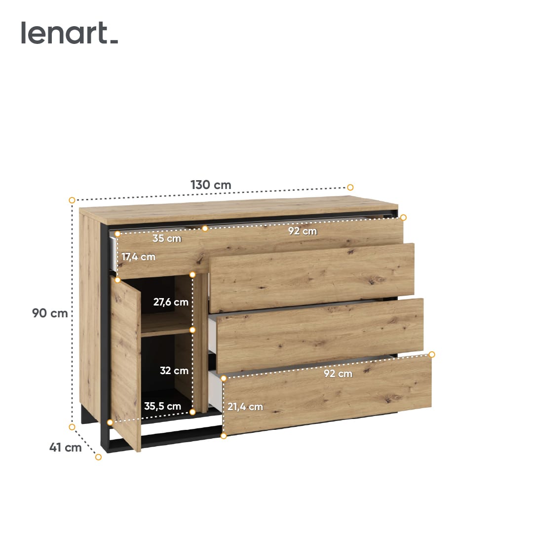 Szeroka komoda z czterema pojemnymi szufladami, w których komfortowo przechowasz dokumenty, odzież lub inne drobiazgi. W komodzie znajduje się również spora szafka z drzwiami.
