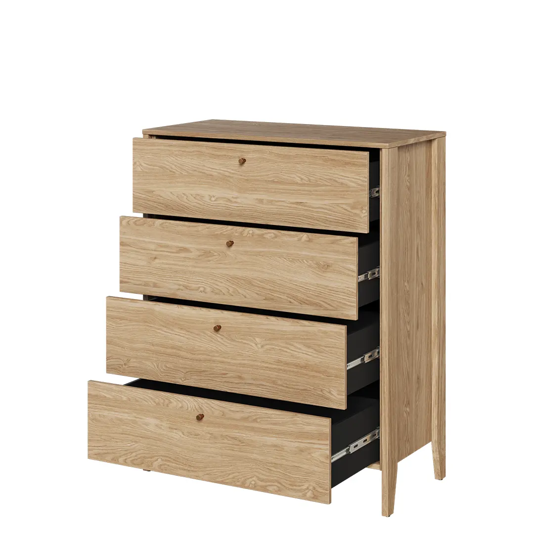 Mała komoda do sypialni z kolekcji COZY to funkcjonalność i styl w jednym. Poszukujesz mebla, który pomieści drobiazgi, a jednocześnie nada wnętrzu wyjątkowego uroku? CZ-03 to odpowiedź na Twoje potrzeby. To praktyczne rozwiązanie zaprojektowane z myślą zwłaszcza o niewielkich pomieszczeniach. Jej kompaktowe wymiary pozwalają na umieszczenie jej nawet w niedużych wnętrzach, a cztery pojemne szuflady zapewniają mnóstwo miejsca na przechowywanie. Na górze znajduje się blat, na którym można postawić lampkę nocną, zdjęcia czy inne dekoracje. Teraz już zawsze będziesz mieć wszystkie niezbędne przedmioty zawsze pod ręką.