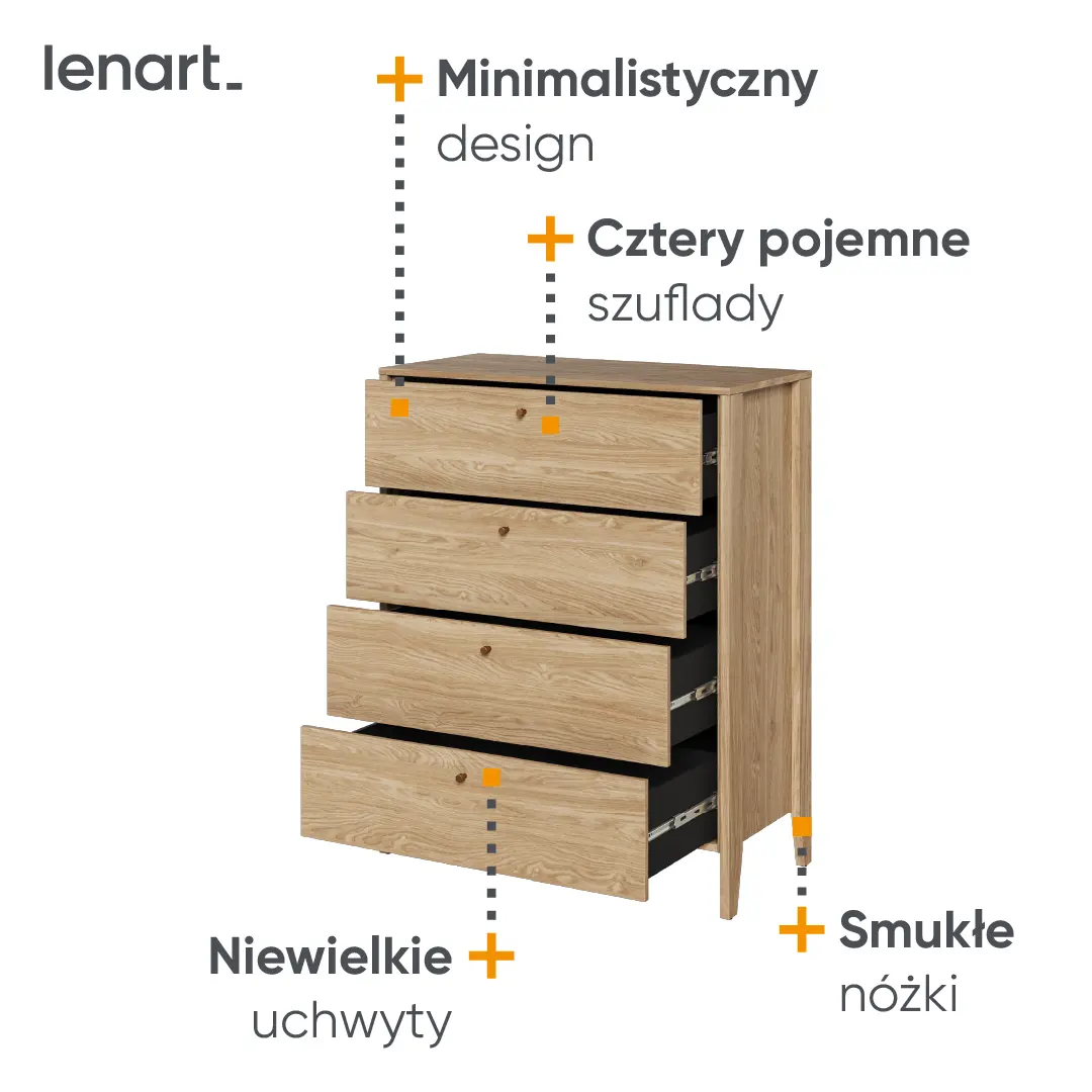 Dzięki naszej komodzie do sypialni, utrzymanie porządku stanie się dużo prostsze. Możesz przechowywać w niej bieliznę, ubrania, czy też kosmetyki, unikając niepotrzebnego bałaganu. To nie tylko oszczędność przestrzeni, to także sposób na stworzenie harmonijnej atmosfery w Twojej sypialni.