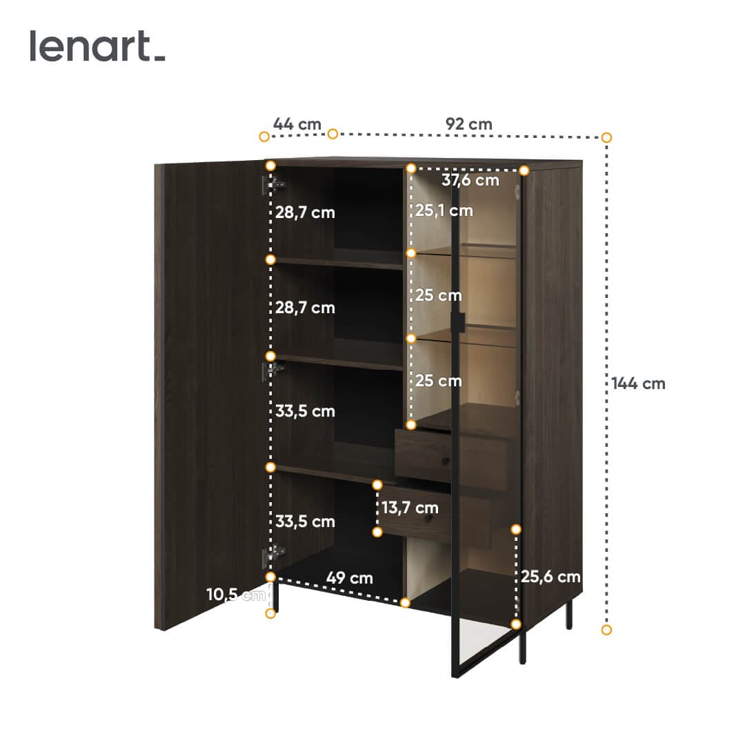 Przede wszystkim, nowoczesna witryna charakteryzuje się niezwykłą pojemnością. Dzięki wielu półkom i szufladom, umożliwia przechowywanie różnego rodzaju przedmiotów, takich jak książki, dekoracje, pamiątki czy zastawa stołowa. Nowoczesna witryna PE-06 posiada wbudowane oświetlenie, które pozwala na wyeksponowanie przechowywanych przedmiotów i podkreślenie ich piękna.