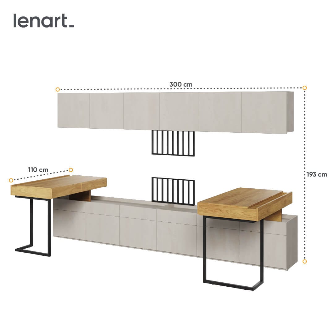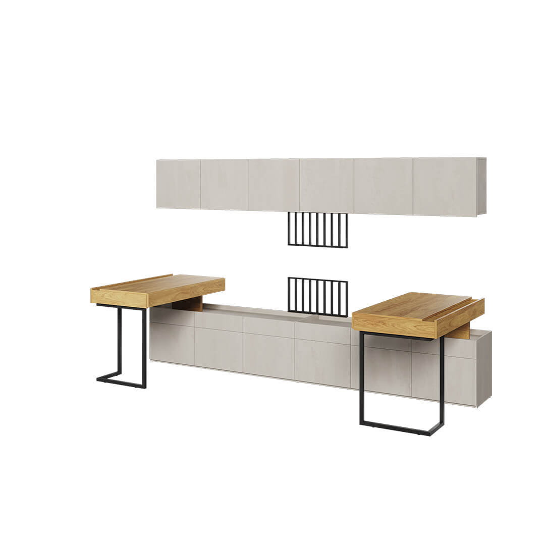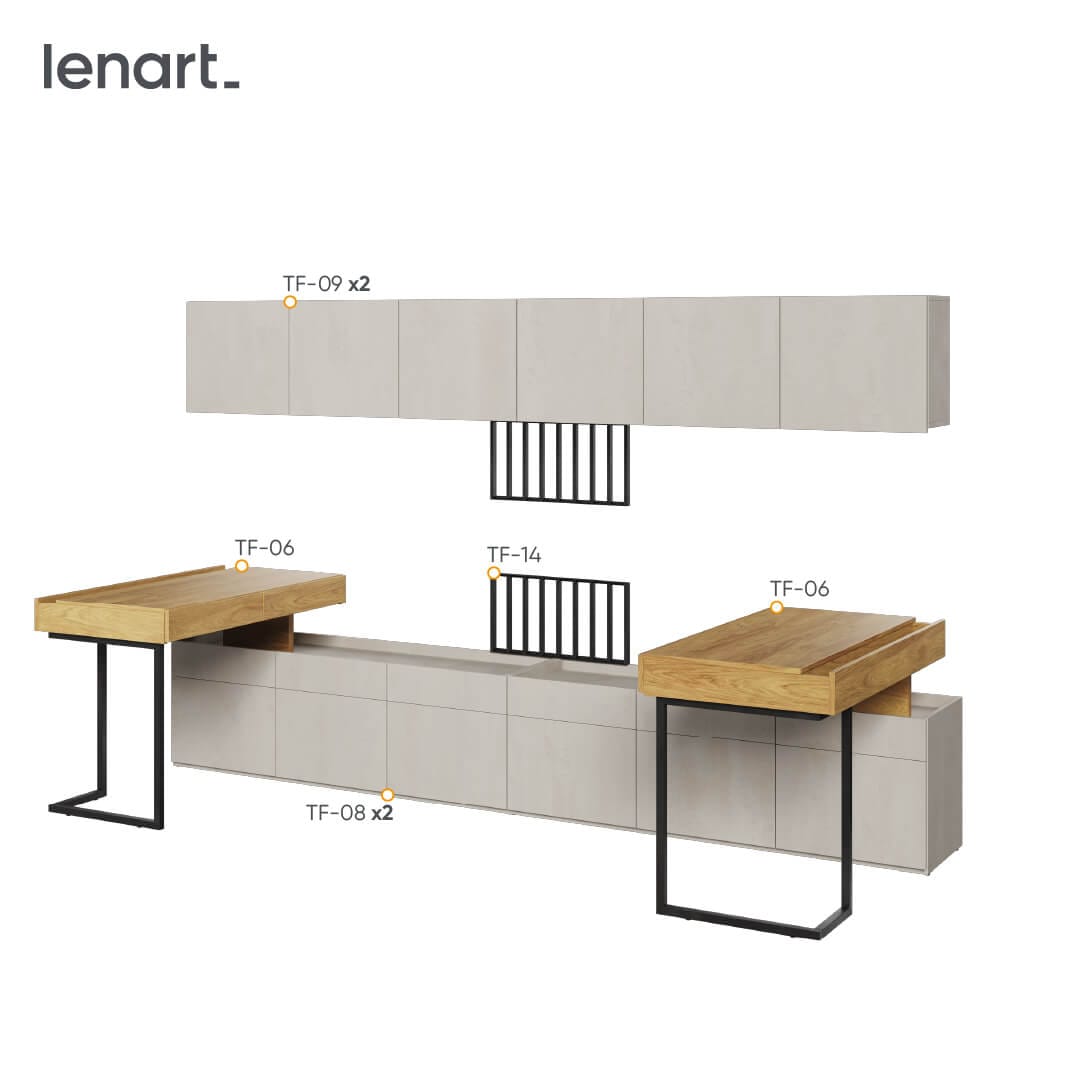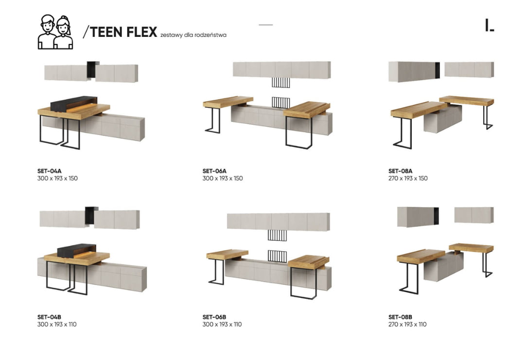 Meble z biurkiem z kolekcji TEEN FLEX z łatwością dopasujesz do swoich potrzeb i wielkości pomieszczenia. Gotowy SET-06B składa się z siedmiu elementów: dwóch biurek TF-06, dwóch szafek TF-08, dwóch szafek wiszących TF-09 oraz panelu TV TF-14. Dzięki uniwersalnej kolorystyce mebli to Ty decydujesz o ostatecznym charakterze wnętrza. Na środku zestawu zaplanowano panele TV w formie lameli, które zostały wyposażone w oświetlenie o energetyzującej pomarańczowej barwie. Nie tylko pełnią rolę dodatkowego źródła światła, ale także wprowadzają do wnętrza ciekawy klimat. Nowoczesne meble młodzieżowe TEEN FLEX to gotowy przepis na wnętrze w designerskim stylu.