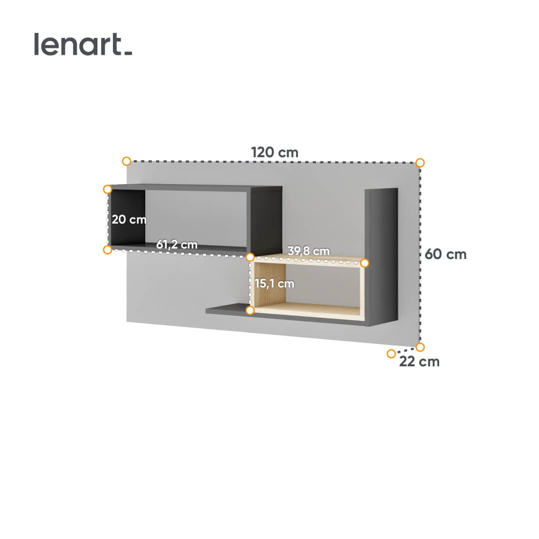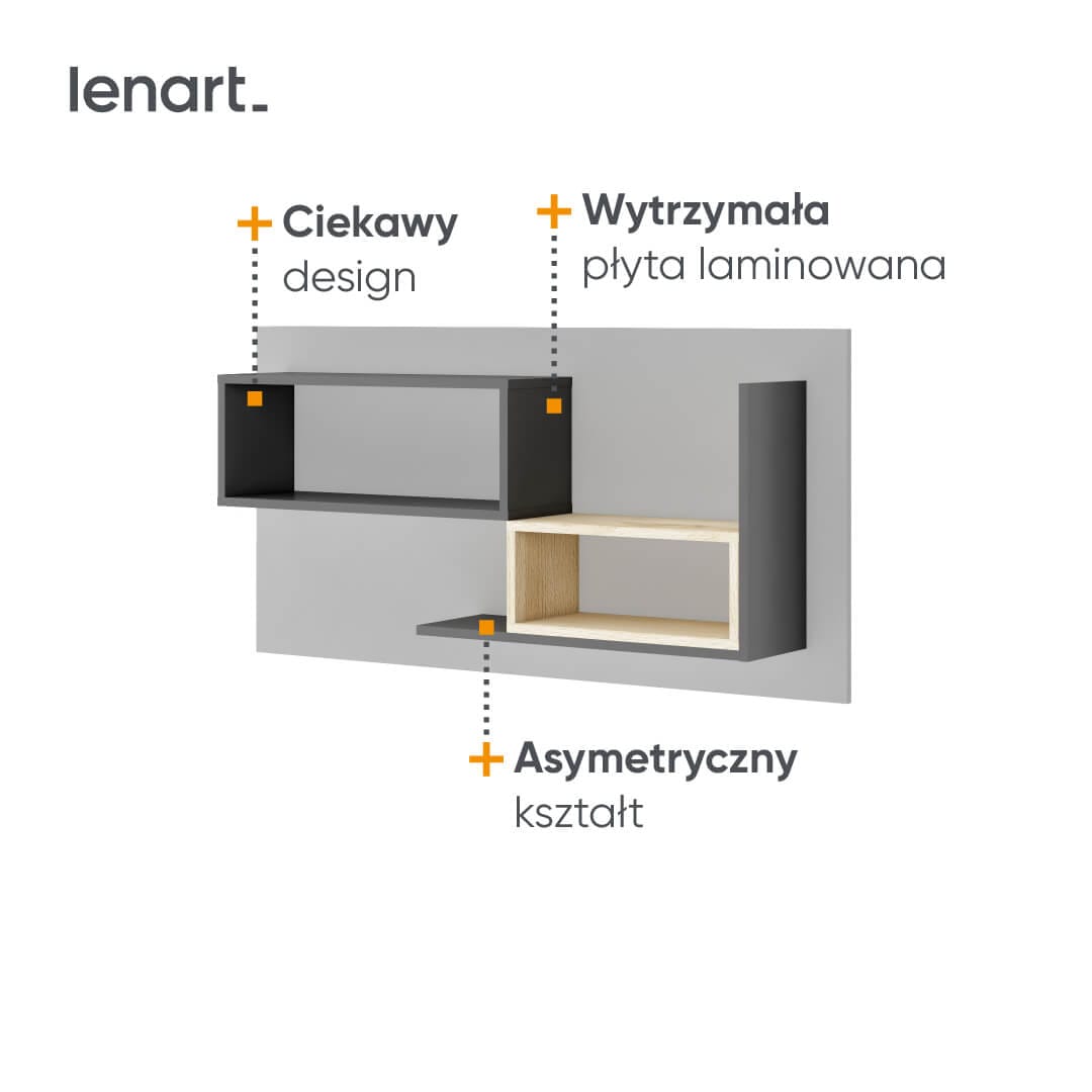 Oryginalna i asymetryczna półka wisząca zapewnia dodatkowe miejsce do przechowywania książek. Mebel pozwala wykorzystać ściany do przechowywania i ergonomicznie zarządzać domową przestrzenią.