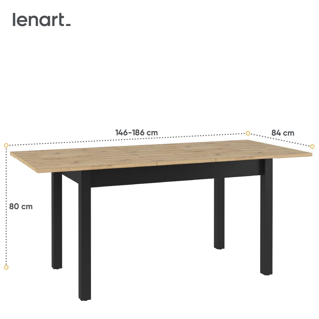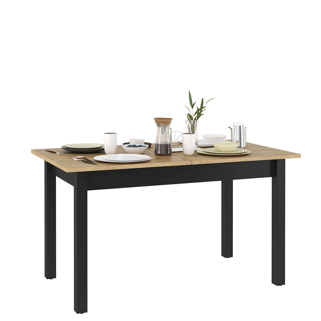 Elegancki, rozkładany stół w nowoczesnym stylu. Czarne, smukłe nogi w połączeniu z blatem imitującym naturalne drewno tworzą zestaw o niepowtarzalnym, loftowym charakterze.