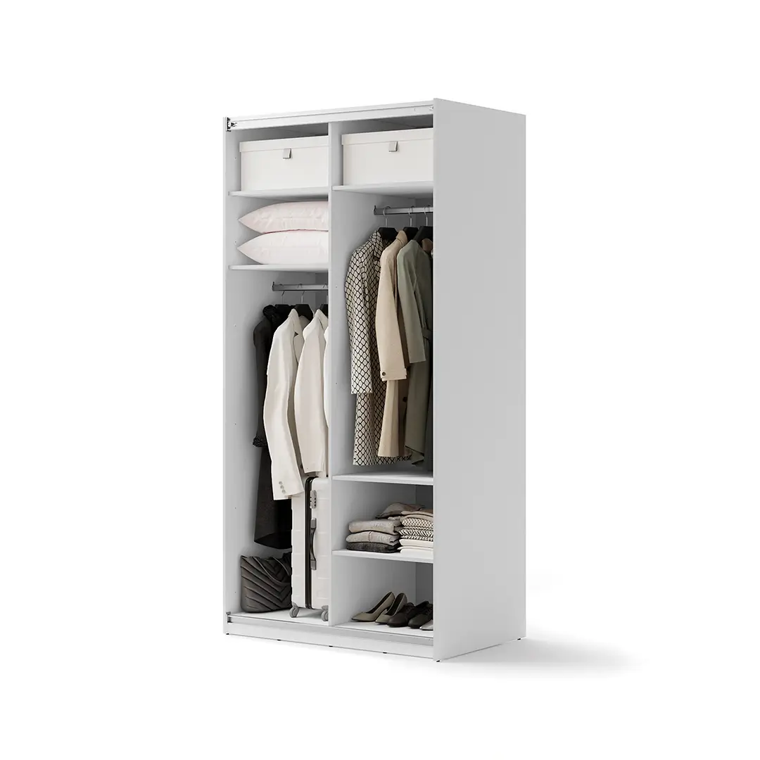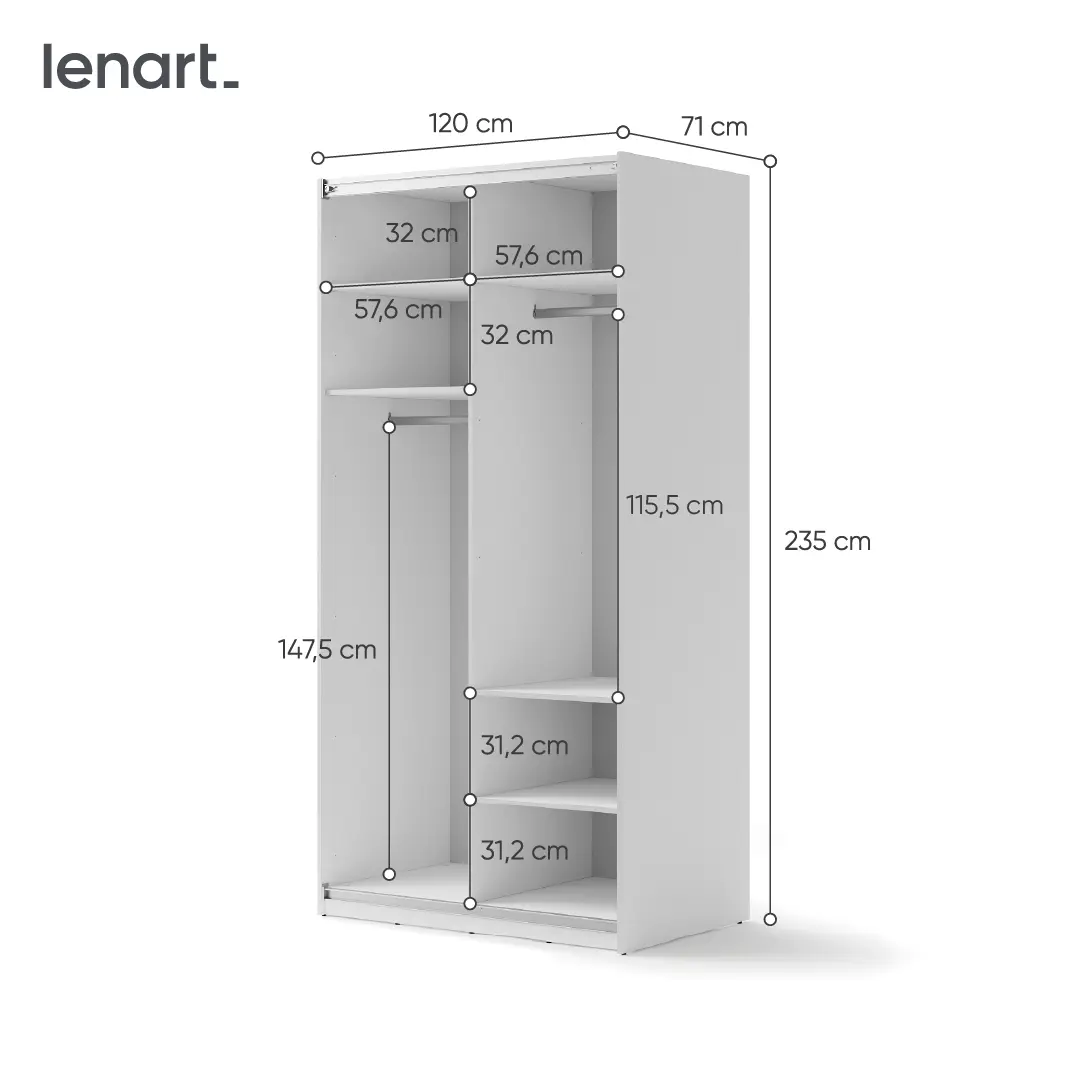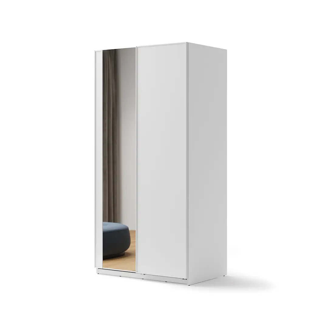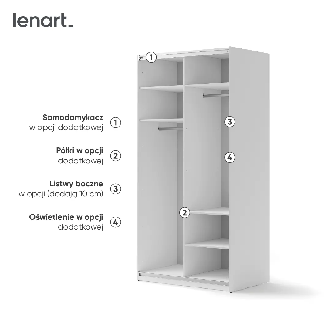 Zainwestuj w komfort i funkcjonalność z naszą białą szafą z lustrem o szerokości 120 cm. Dodatkowo szafę możesz doposażyć o samodomykacz do drzwi przesuwnych, kontenerek, półki dzięki którym z łatwością dostosujesz wnętrze szafy do swoich potrzeb, a także w opaskę z oświetleniem, która z zależności od wolnego miejsca do zagospodarowania pozwoli Ci dopasować szerokość szafy.