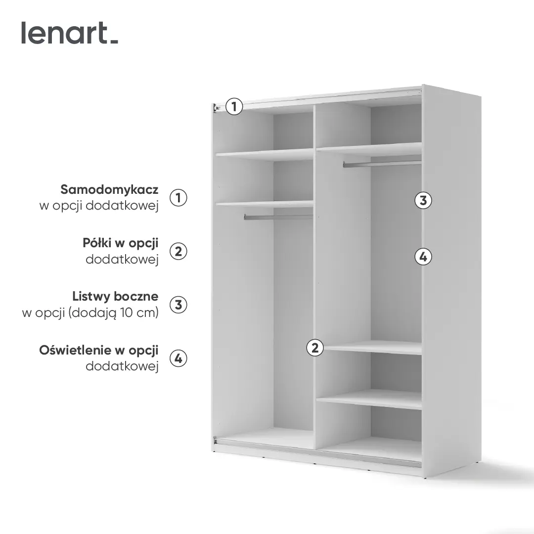 Dodatkowo szafę możesz doposażyć o samodomykacz do drzwi przesuwnych, kontenerek, półki dzięki którym z łatwością dostosujesz wnętrze szafy do swoich potrzeb, a także w opaskę z oświetleniem, która z zależności od wolnego miejsca do zagospodarowania pozwoli Ci dopasować szerokość szafy.