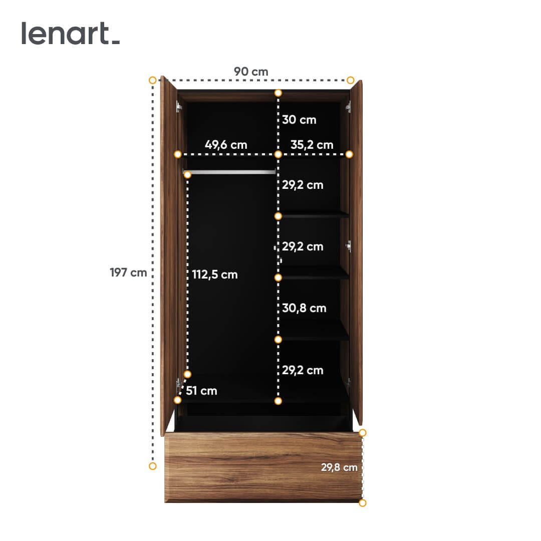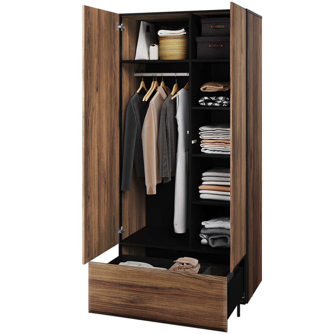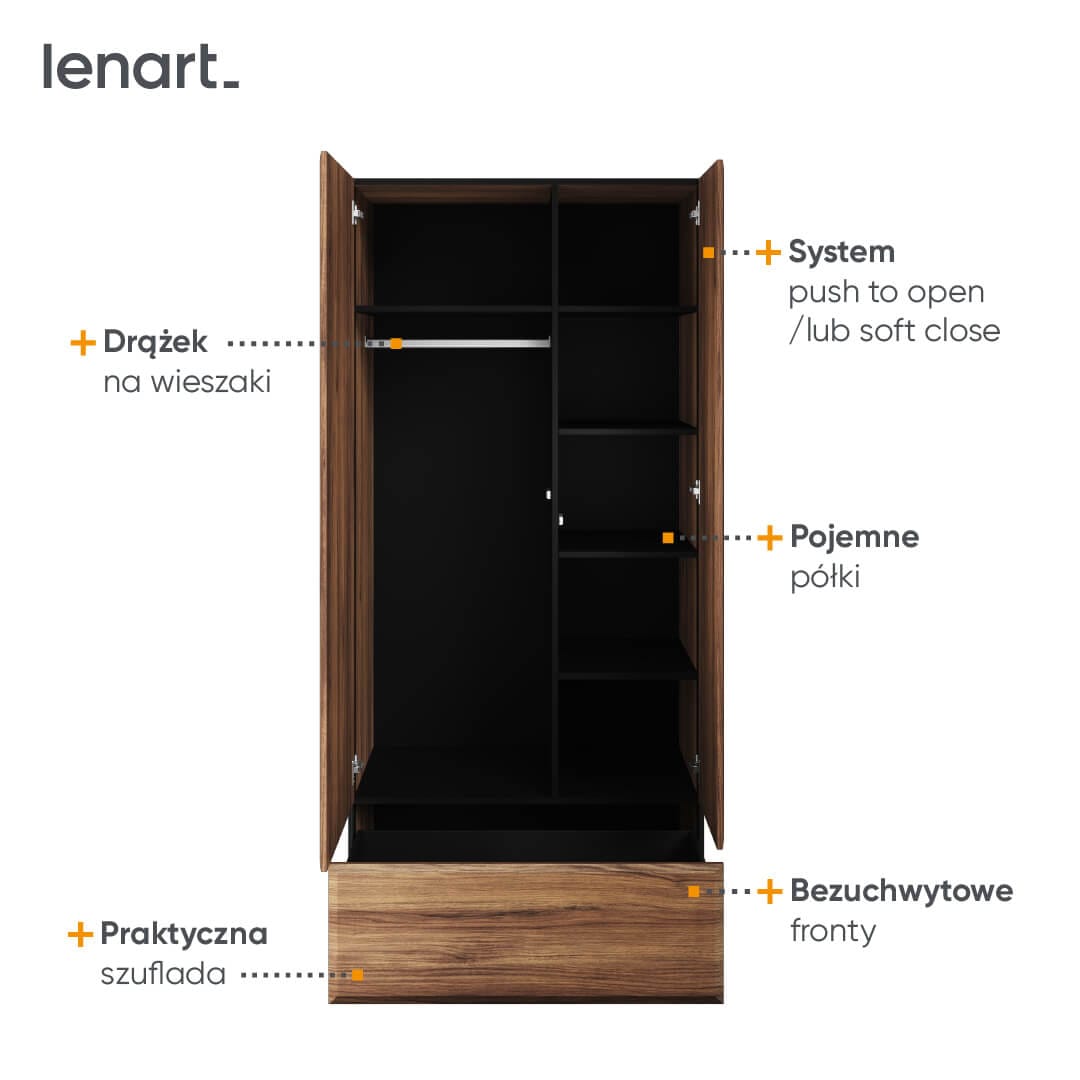 Wnętrze szafy kryje drążek do zawieszenia odzieży o różnej długości oraz wewnętrzny regał z półkami. Dodatkowe miejsce do przechowywania znajduje się na półce nad drążkiem. Na dole szafy zaplanowano bardzo praktyczną i pojemną szufladę.