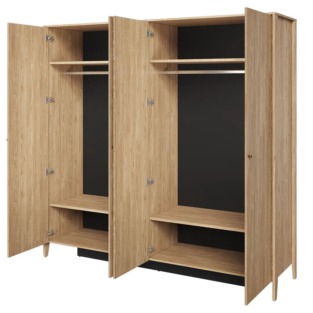 COZY CZ-01 to nie tylko szereg praktycznych rozwiązań do przechowywania odzieży, ale również ciekawy design, który z pewnością będzie wyróżniał się w naszej sypialni. Fronty szafy wykonano z solidnej płyty w odcieniu dębu olejowanego. Stonowany kolor dodaje wnętrzu przytulnego i jednocześnie eleganckiego charakteru. Podwójne lustro powiększa przestrzeń, dzięki czemu pomieszczenie wydaje się większe niż jest w rzeczywistości. Całość uzupełniają niewielkie uchwyty do uchylania drzwi, które nie zaburzają jednolitego wykończenia frontów.