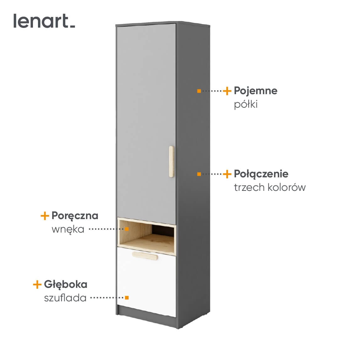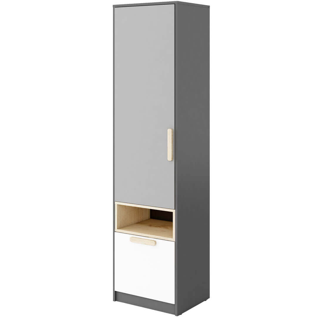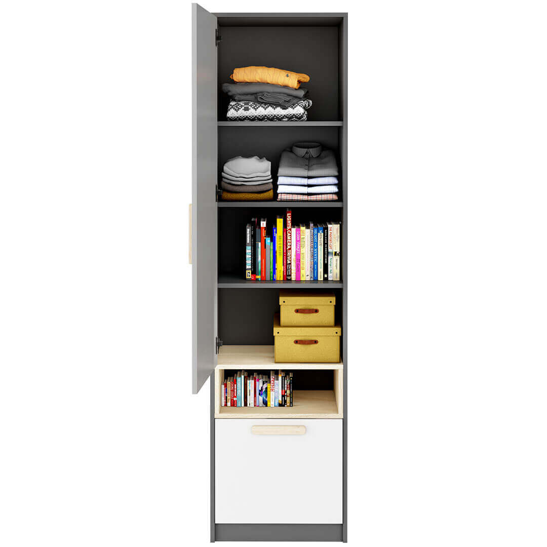 Kompaktowa w wymiarach, jednodrzwiowa szafa na odzież, zabawki i szkolne akcesoria. Wewnątrz znajdziesz pojemne półki i głęboką szufladę. Znalazło się też miejsce na przydatną wnękę na