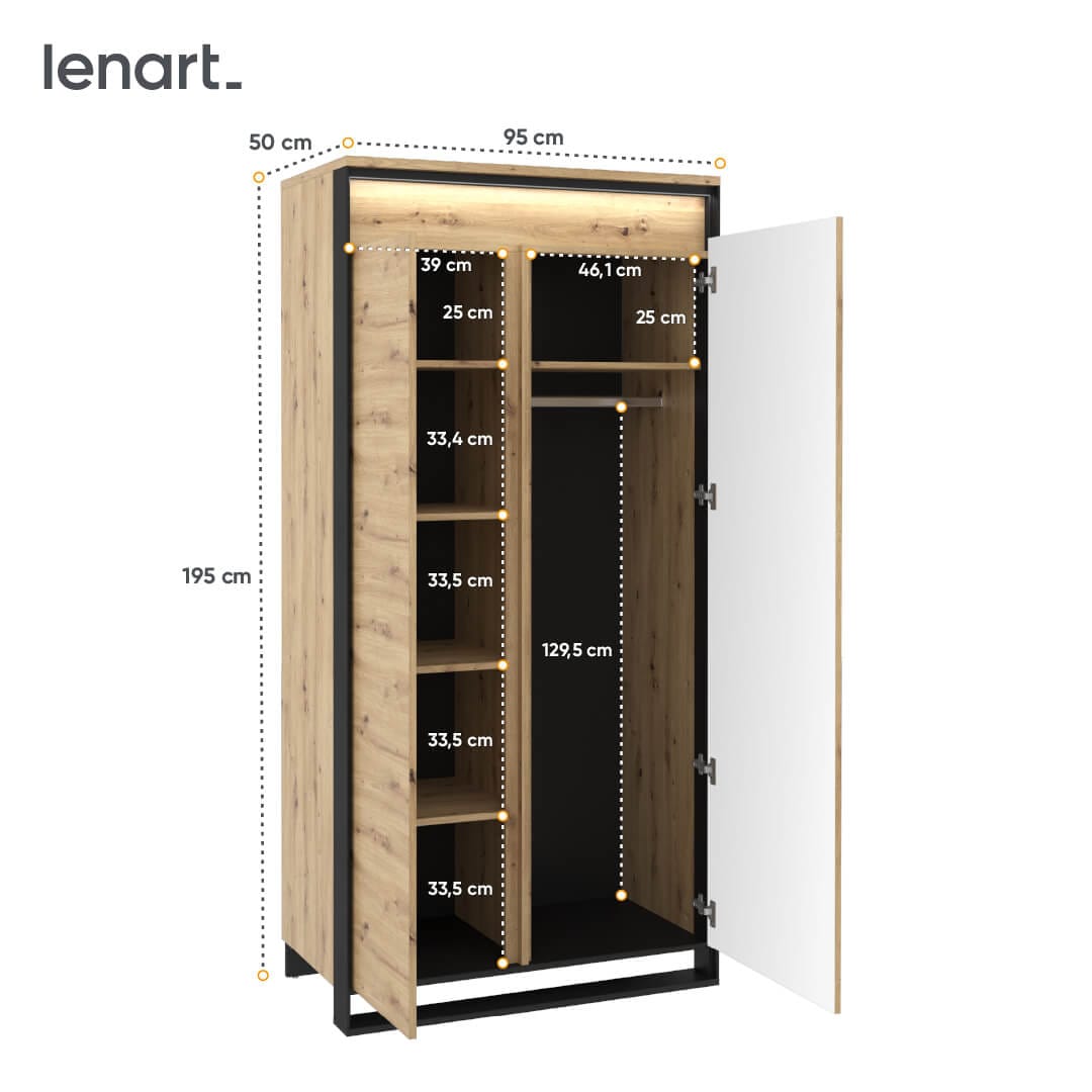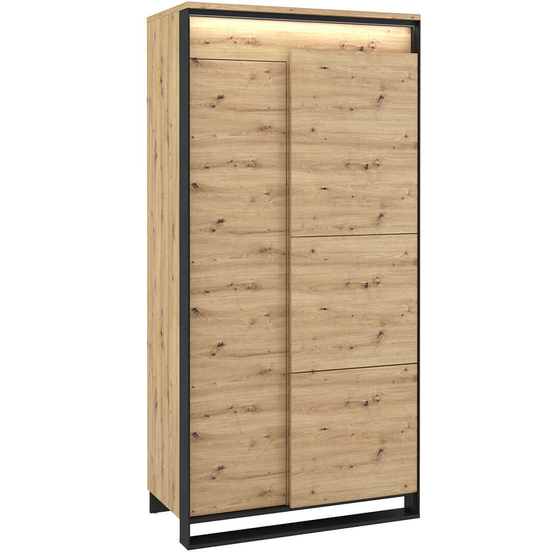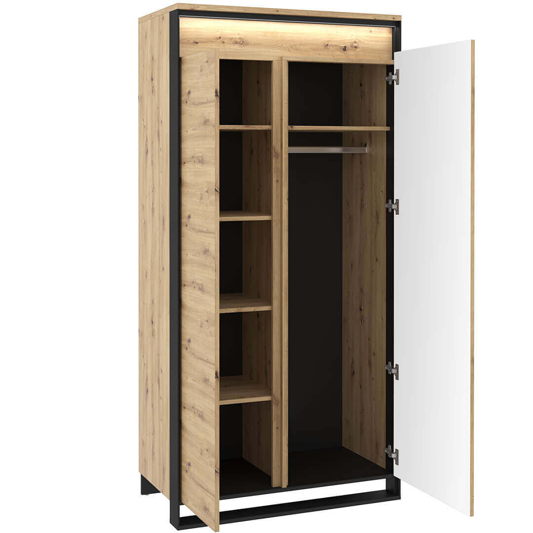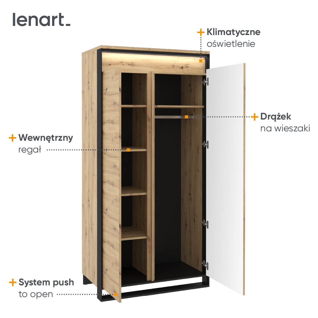 Szafę zaprojektowano w modnym, loftowym stylu. Ciekawy dekor o wyraźnym rysunku drewna znakomicie wygląda w towarzystwie czarnych detali. Trójwymiarowy charakter frontów został dodatkowo podkreślony przez ledowe oświetlenie.