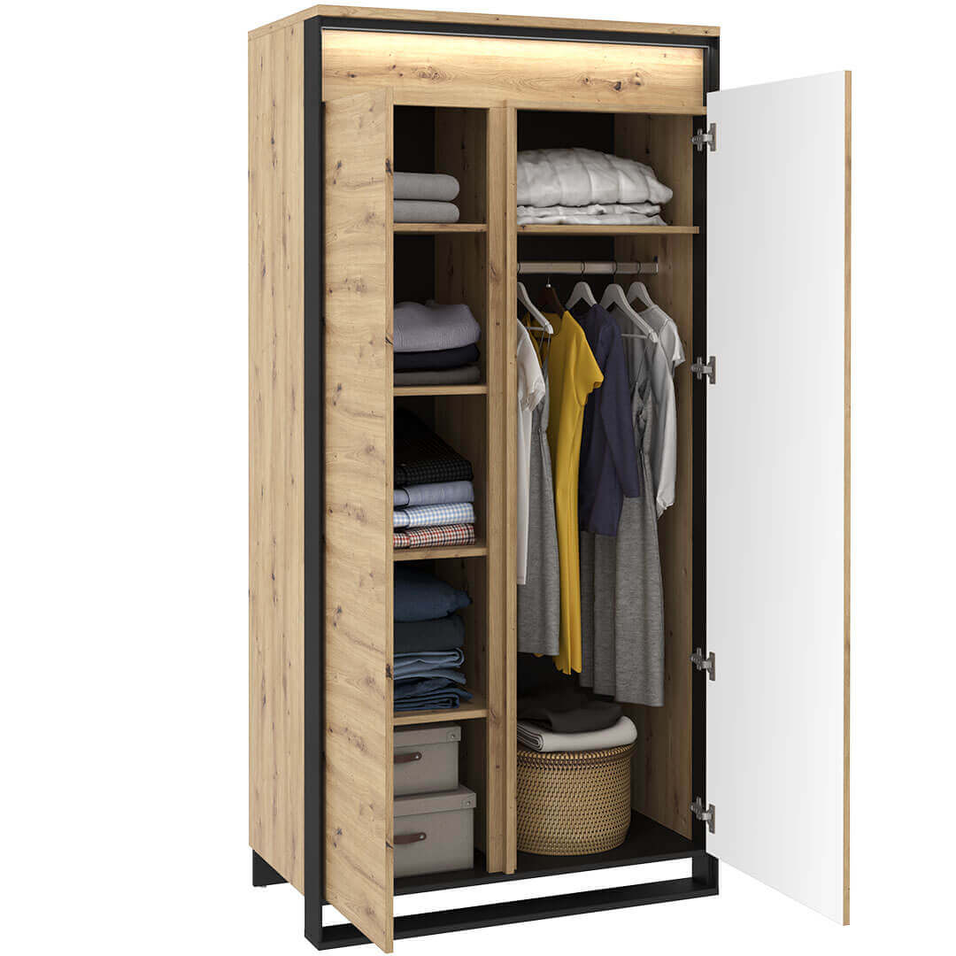 Pojemna szafa dwudrzwiowa z drążkiem na wieszaki oraz wewnętrznym regałem z półkami. Funkcjonalny podział wnętrza szafy pozwala wygodnie rozmieścić garderobę i tekstylia, a na wieszakach zawiesić ubrania różnej długości.