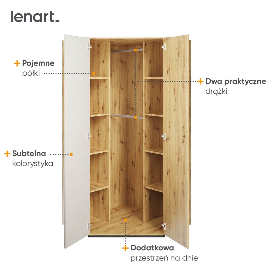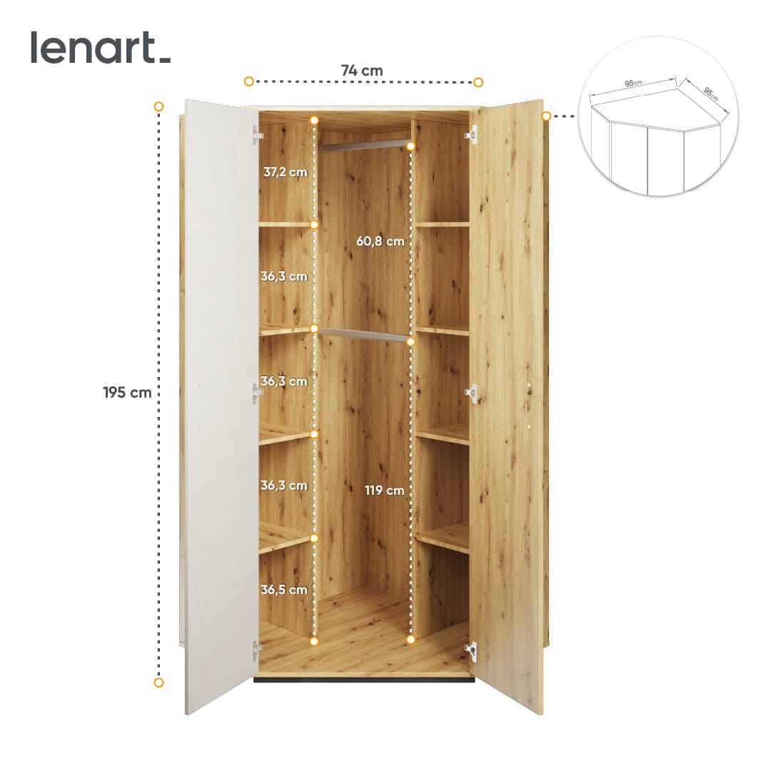 Szafa narożna QUBIC pomieści pokaźną ilość garderoby, obuwia oraz torebek i plecaków. Dwa praktyczne drążki umożliwiają wygodne zawieszenie ubrań różnej długości. Dwa wewnętrze regały z półkami pozwalają komfortowo przechowywać ubrania i inne akcesoria. Na dodatkowej przestrzeni na dnie szafy można wygodnie ułożyć np. pudełka z obuwiem albo sprzęt sportowy.