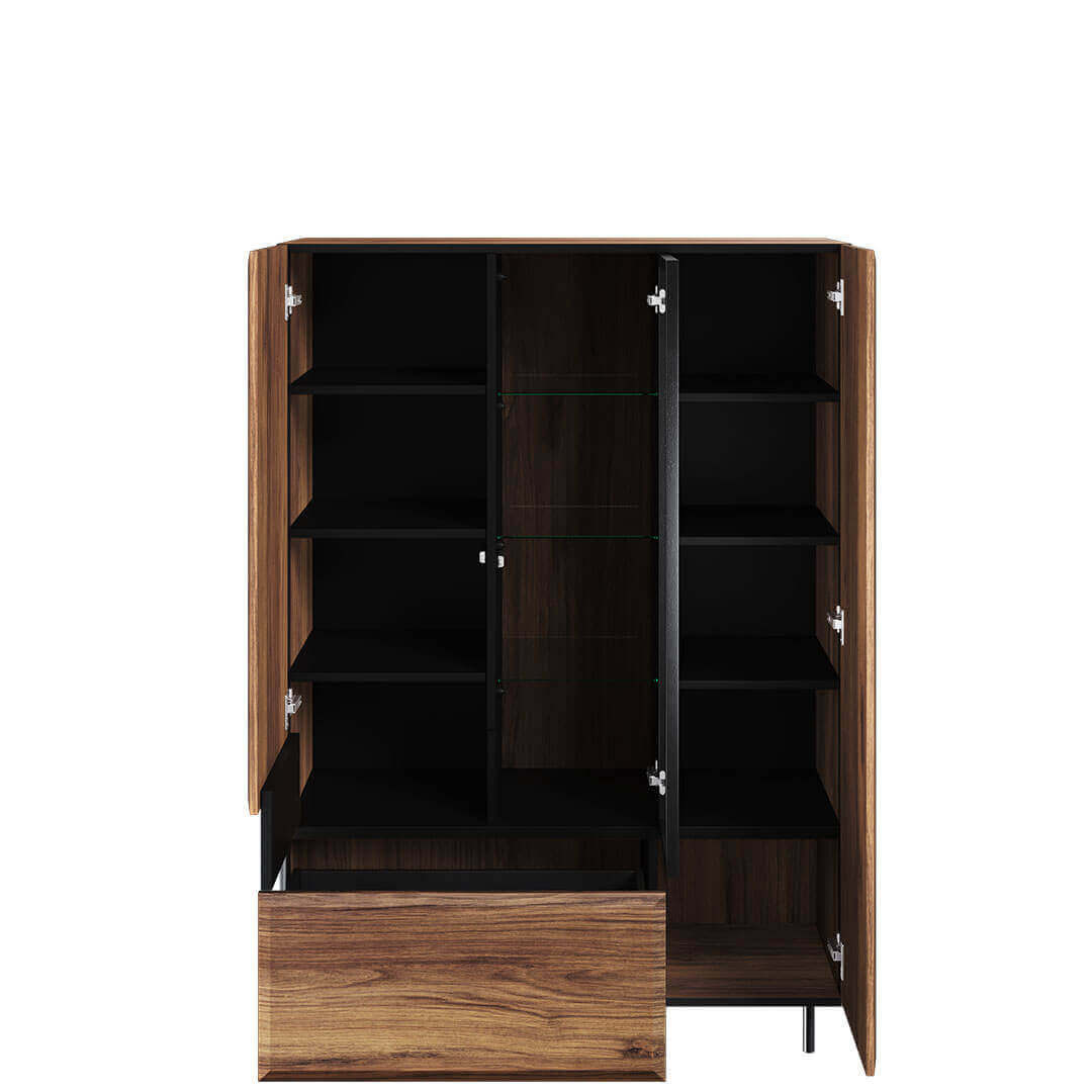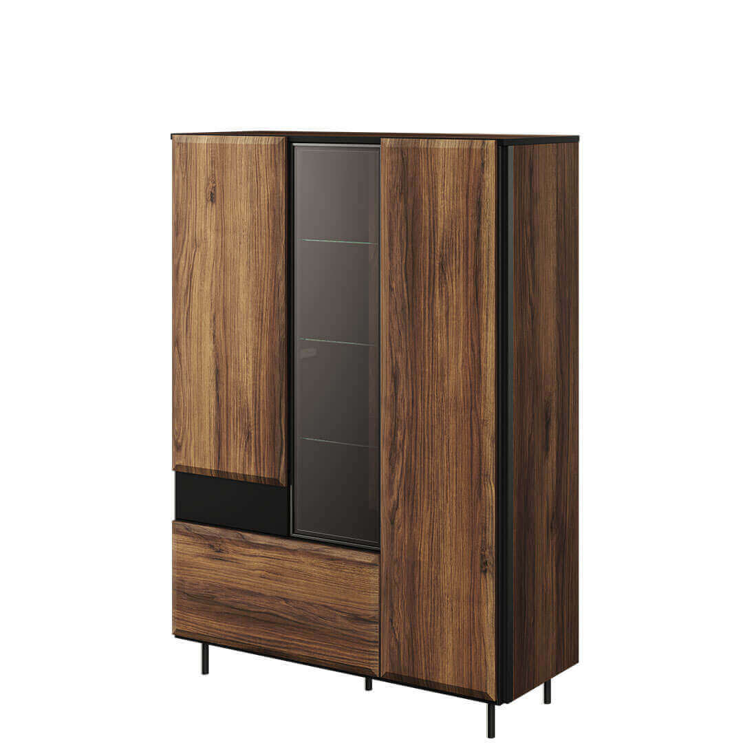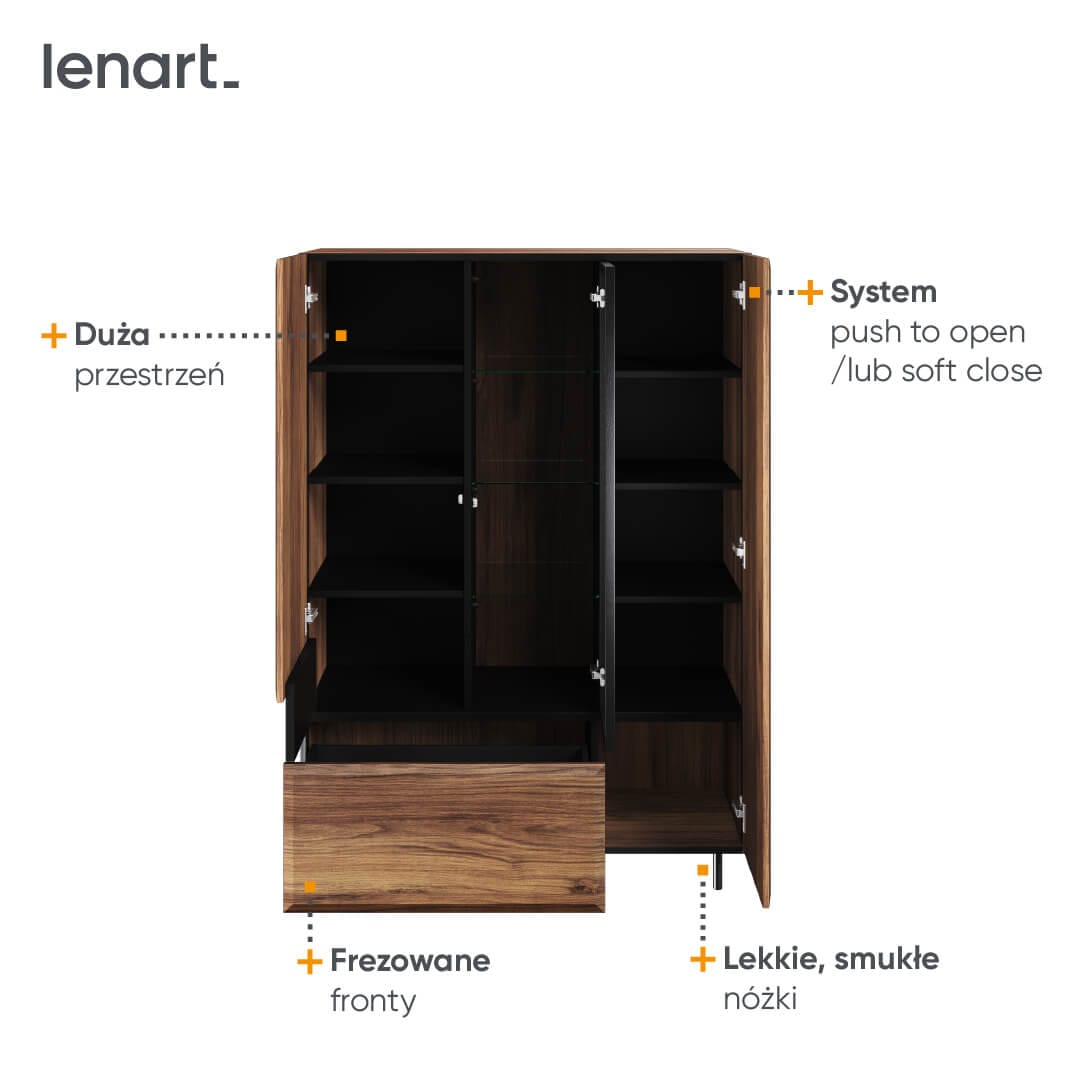Pojemna witryna w stylu nowoczesnej elegancji. Unikatowy styl mebla to zasługa charakterystycznych, dzielonych frontów z ciekawie frezowanymi krawędziami. O ich wygodne otwieranie zadbał system push to open i/lub soft close. Modne, metalowe ramy wyznaczają kształt przeszklonej części mebla. Witryna wspiera się na lekkich, bardzo smukłych nóżkach. Połączenie czerni z dekorem w kolorze ciemnego drewna prezentuje się modnie, stylowo, a jednocześnie wprowadza do wnętrza dużo przytulnego ciepła.