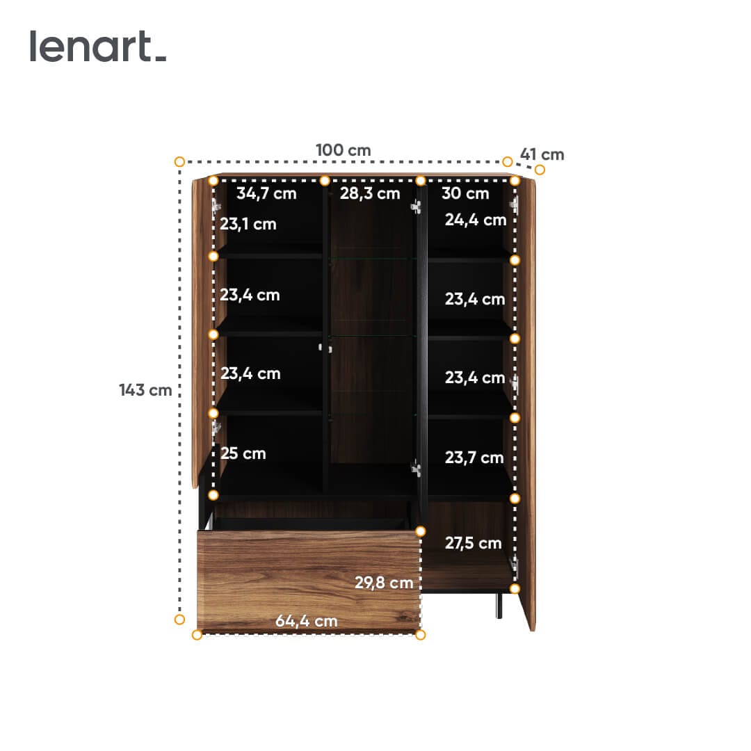 Witryna posiada trzy szklane półki na których możesz wyeksponować porcelanę, szkło lub ulubione dekoracje. Mebel można wyposażyć w kierunkowe oświetlenie ledowe, które pozwala skierować strumień światła na wybrane przedmioty umieszczone za szkłem. Za drzwiami kryją się dwa wewnętrzne regały z pokaźną ilością miejsca do przechowywania. Na dole mebla znajduje się pojemna i łatwo dostępna szuflada.