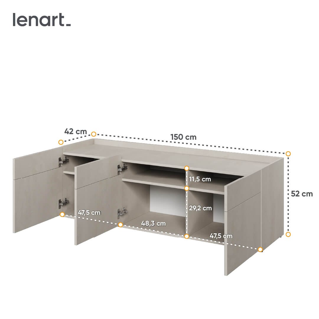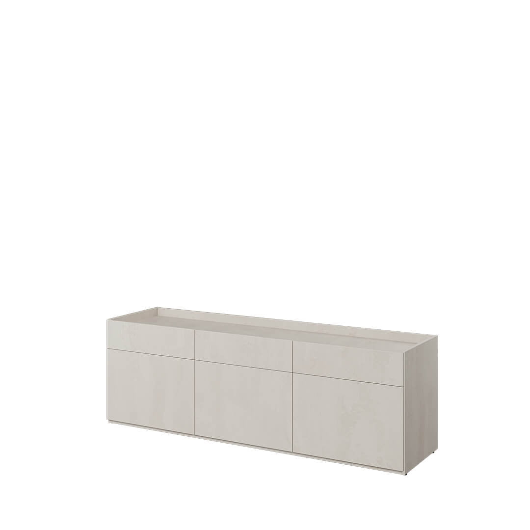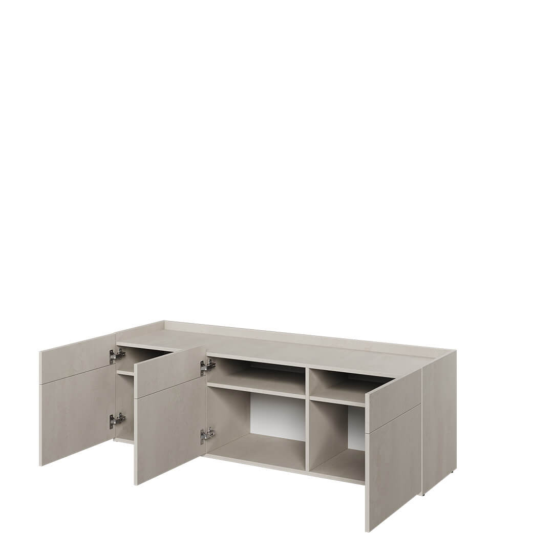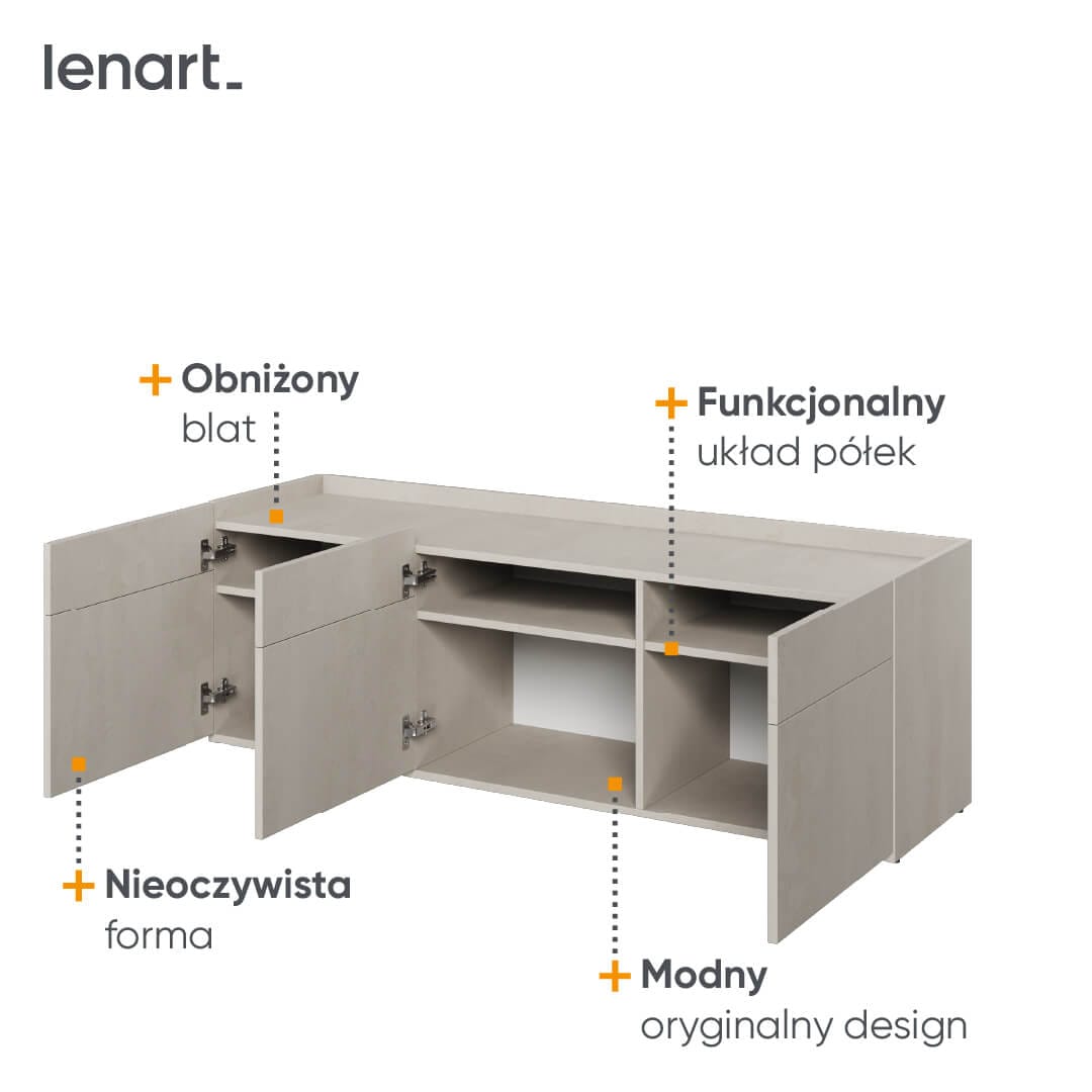 Nowoczesna szafka do pokoju młodzieżowego z trojgiem drzwi. W swoim wnętrzu skrywa funkcjonalny układ półek, który ułatwi utrzymywanie porządku. Mebel został wyposażony w obniżony blat, dzięki któremu rzeczy wyeksponowane na jego powierzchni są zabezpieczone przed upadkiem. Z powodzeniem możemy zaaranżować ją na przykład jako szafkę RTV.