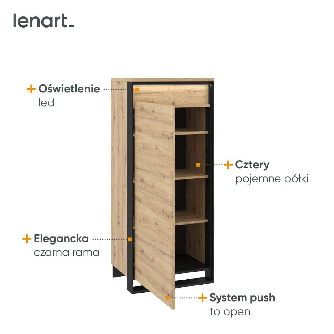 Szafka wyróżnia się modnym, industrialnym charakterem. Ciekawy dekor o wyraźnym rysunku drewna znakomicie wygląda w towarzystwie czarnych detali. Trójwymiarowy charakter frontów został dodatkowo podkreślony przez ledowe oświetlenie (dostępne w komplecie).