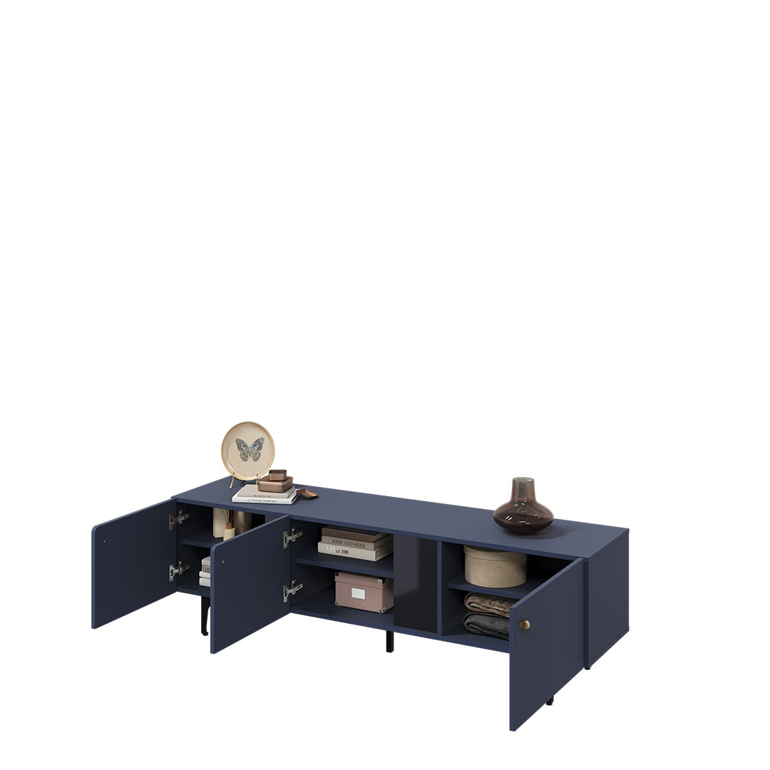Oryginalny charakter szafki RTV to zasługa zdecydowanego wybarwienia – ciemny błękit w połączeniu z połyskującą czernią prezentuje się ciekawie i nietypowo. Zaskakująca jest też forma – smukłe nóżki, zgrabne uchwyty o barwie złota oraz zaokrąglenia na wybranych frontach nadają meblowi wyrazisty charakter.