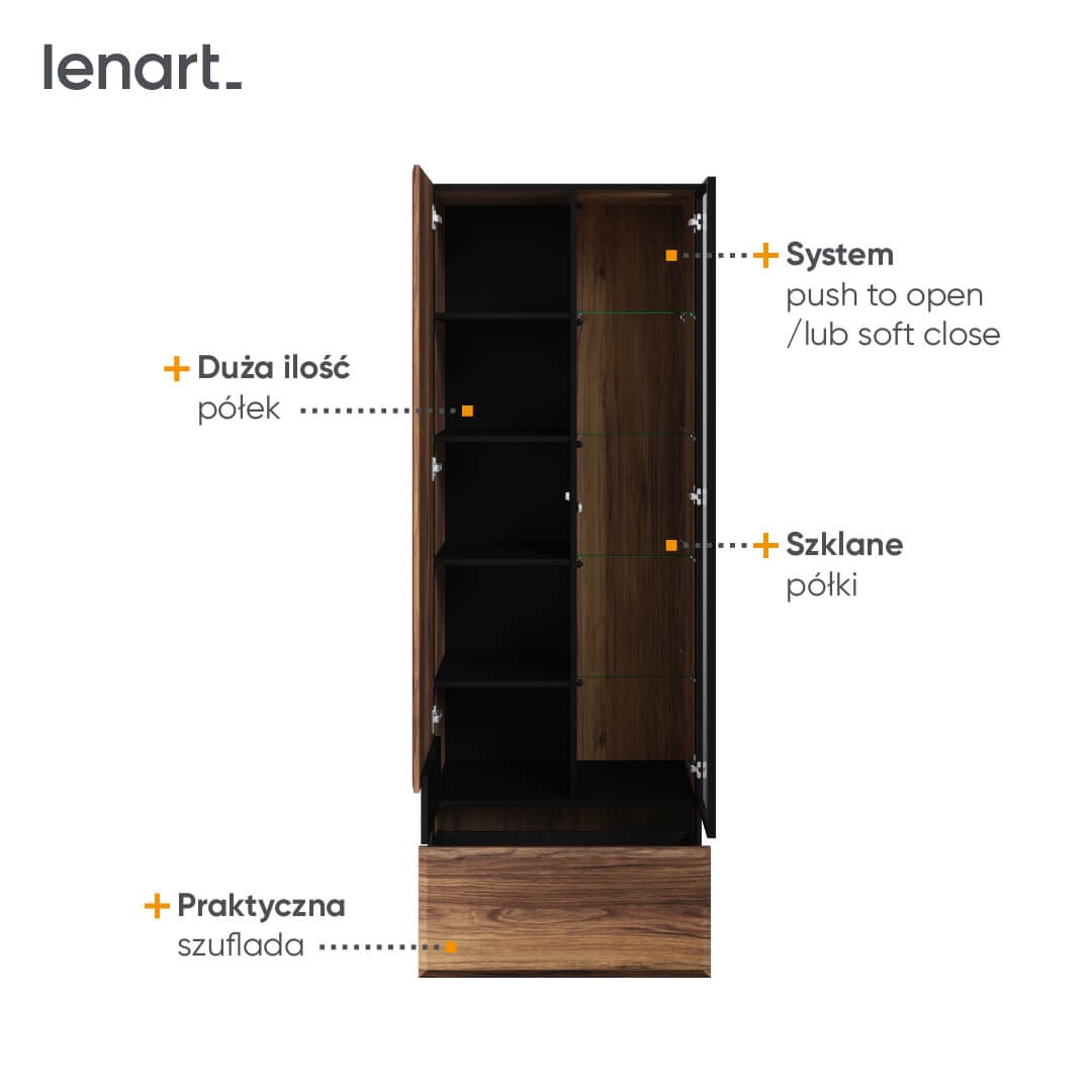 Wysoka i pojemna witryna w stylu nowoczesnej elegancji. Unikatowy styl mebla to zasługa charakterystycznych, dzielonych frontów z ciekawie frezowanymi krawędziami. O ich wygodne otwieranie zadbał system push to open i/lub soft close. Modne, metalowe ramy wyznaczają kształt przeszklonej części mebla. Witryna wspiera się na lekkich, bardzo smukłych nóżkach. Połączenie czerni z dekorem w kolorze ciemnego drewna prezentuje się modnie, stylowo, a jednocześnie wprowadza do wnętrza dużo przytulnego ciepła.