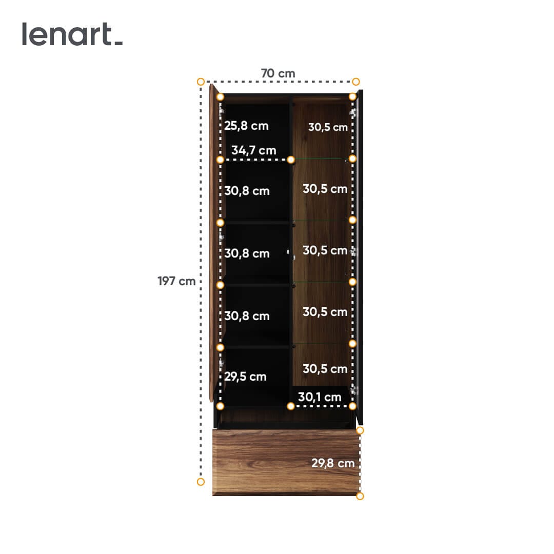 Witryna posiada cztery szklane półki na których możesz wyeksponować porcelanę, szkło lub ulubione dekoracje. Witrynę można wyposażyć w kierunkowe oświetlenie ledowe, które pozwala skierować strumień światła na wybrane przedmioty umieszczone za szkłem. Za drzwiami witryny kryje się wewnętrzny regał z pokaźną ilością miejsca do przechowywania. Na dole mebla znajduje się pojemna i łatwo dostępna szuflada.