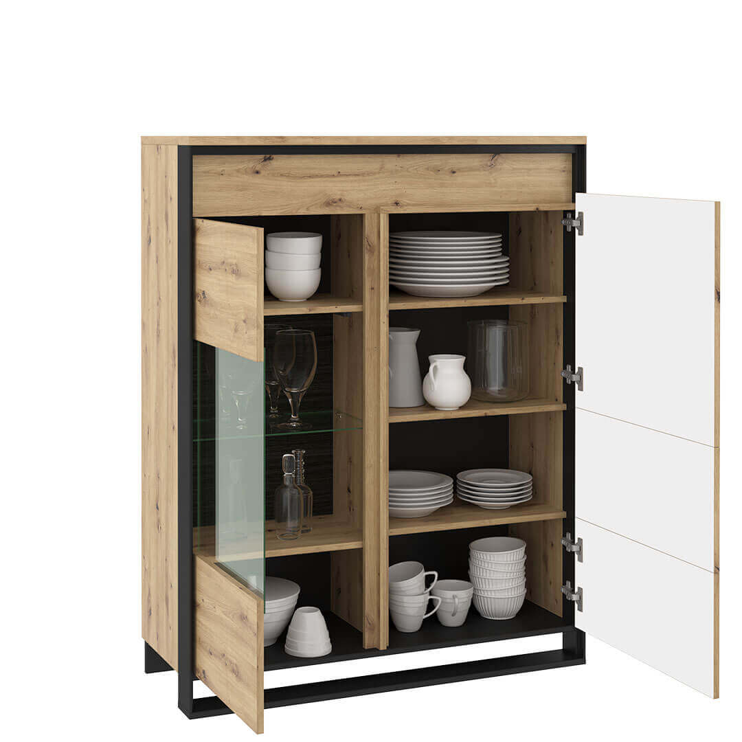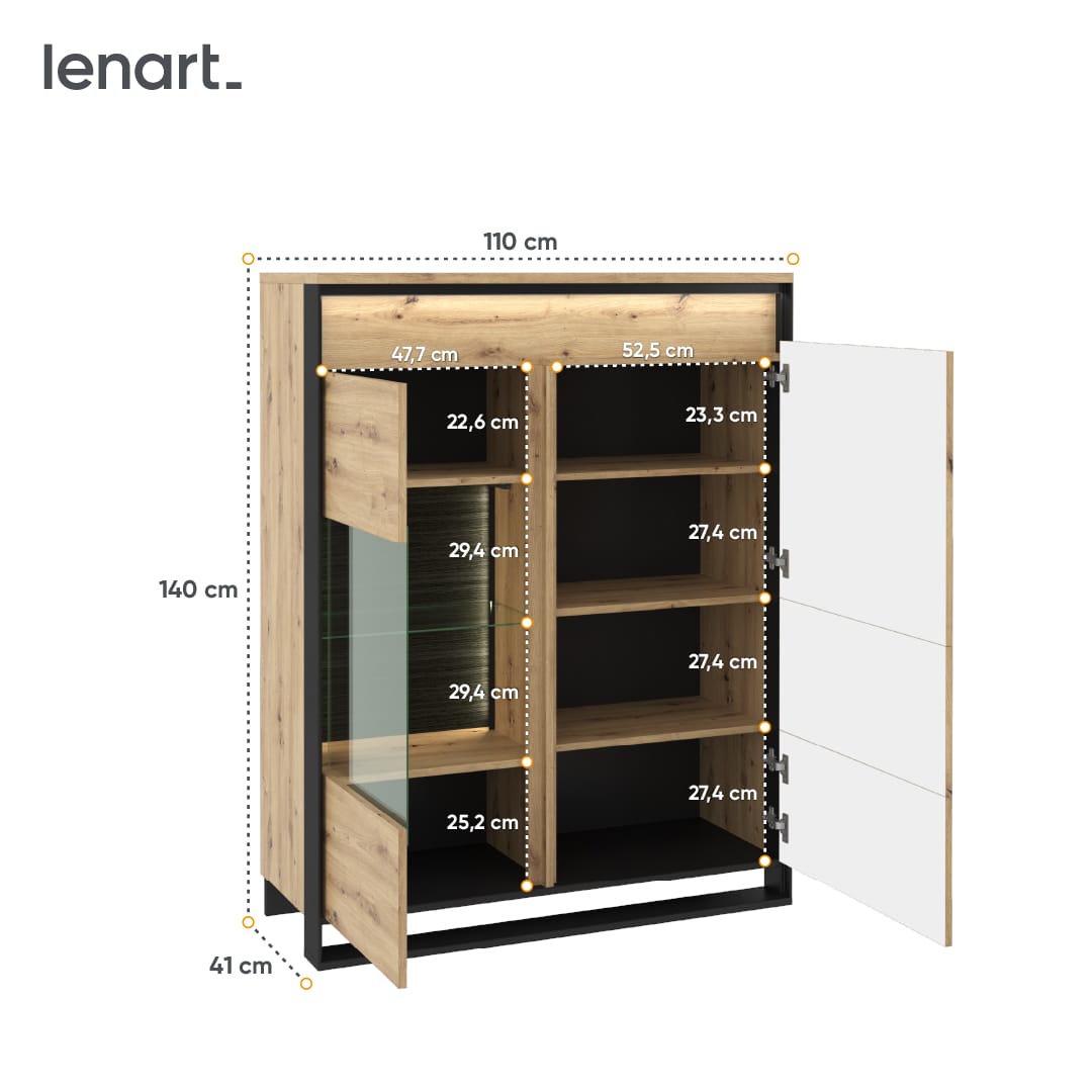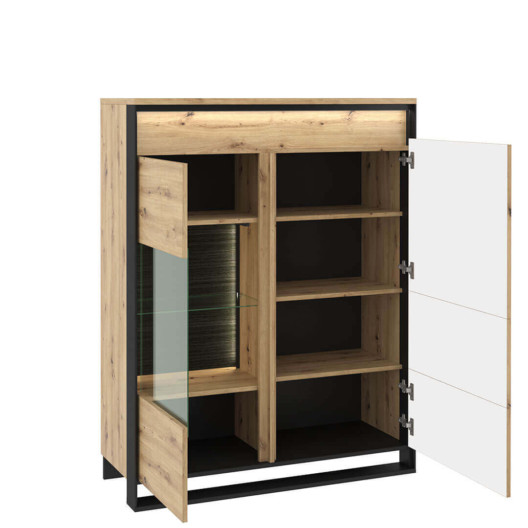 Niska witryna w nowoczesnym, loftowym stylu. Funkcjonalny podział wnętrza pozwala niektóre przedmioty schować, a inne ciekawie wyeksponować. W prawej części mebla znajdziesz zamykany regał z półkami. Lewa strona została podzielona na strefę z przeszkleniem oraz część z drzwiami i wewnętrznymi półkami.